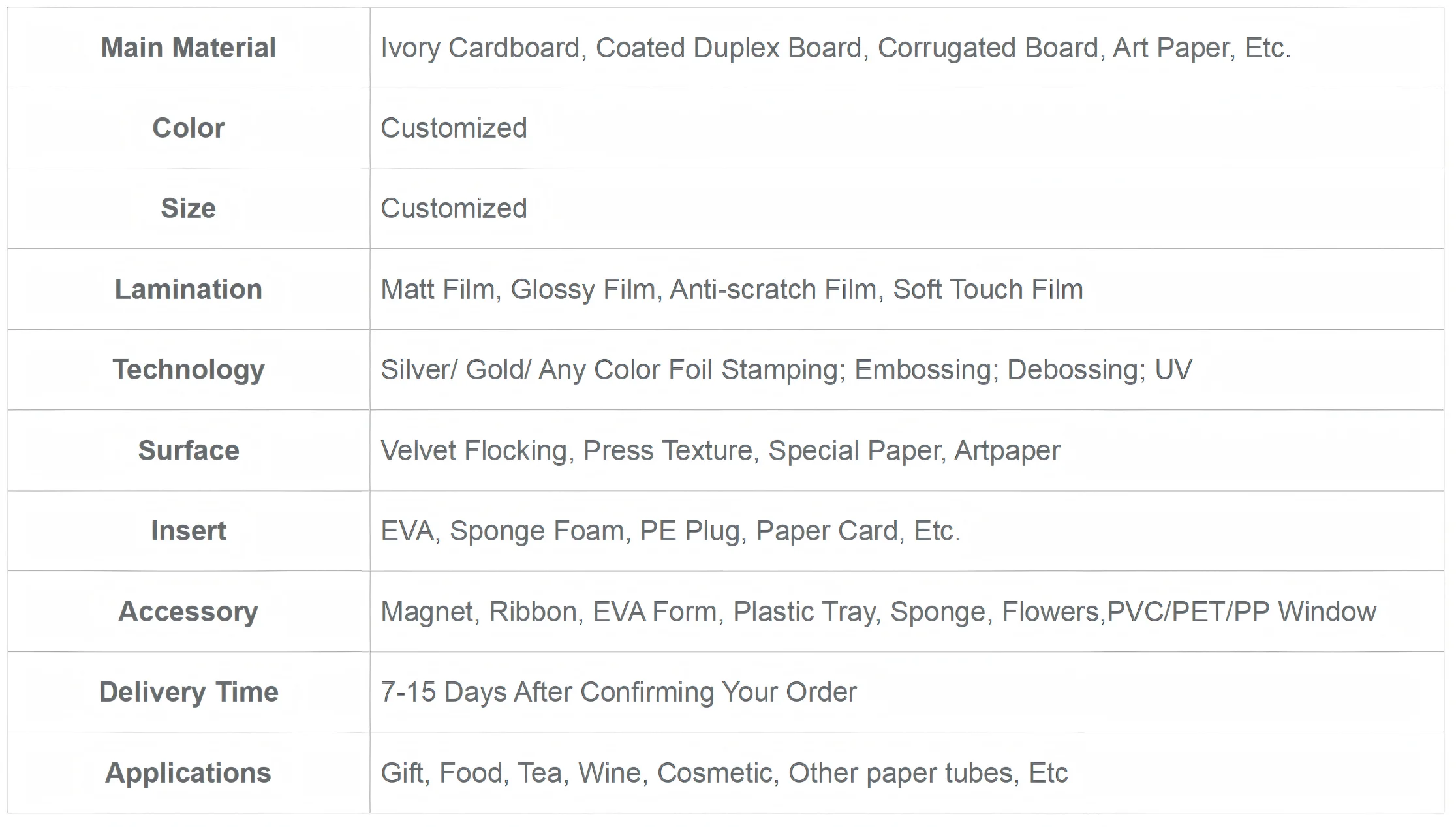 Industrial Use: Jewelry, Clothing, Cosmetics, Electronics, Gift packaging, etc. Printing Handling: Embossing, Glossy Lamination, Matt Lamination, Stamping, UV Coating, Varnishing,VANISHING, Gold Foil
